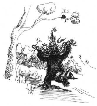 Er bastelte sich einen wunderschönen Hut aus Zweigen und Blüten und rannte damit schnell zum Waldrand.
